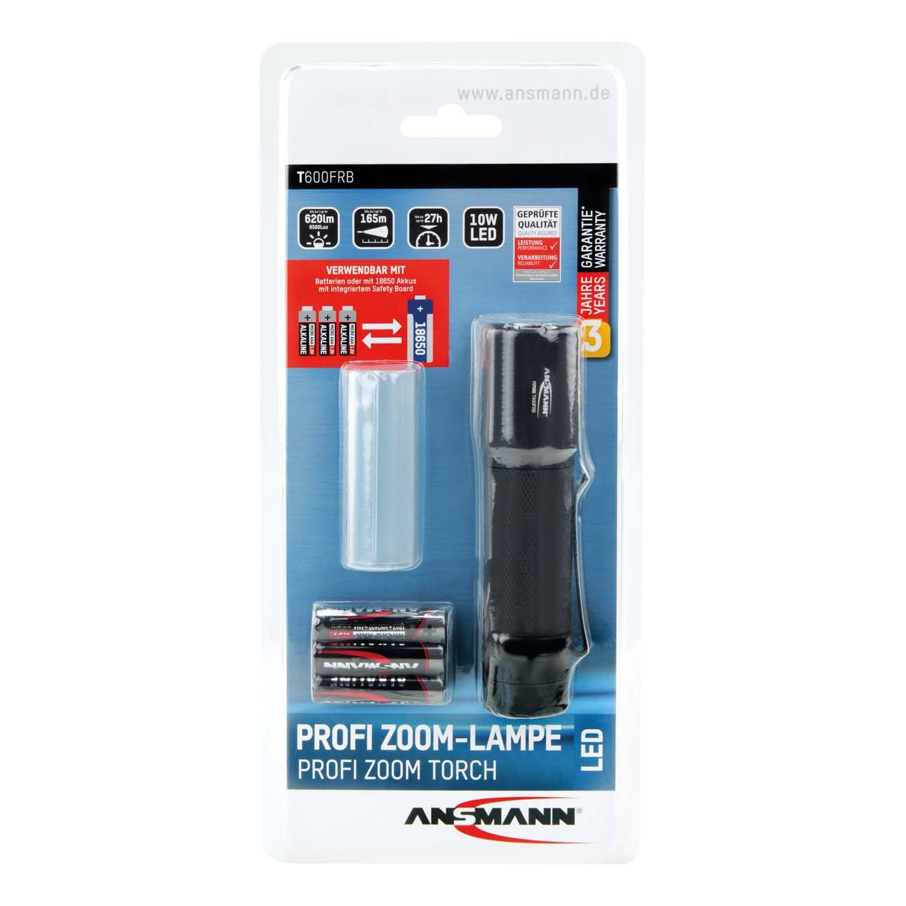 Professionell ficklampa i aluminium. Mycket ljusstark, stöt- och stänkvattenskyddad. Med steglös fokusinställning. Lampan kan drivas både med alkaliska batterier eller med ett 18650 litiumjonbatteri, passande patron för litiumjonbatteriet ingår. Använd laddningsbart litiumjonbatteri med säkerhetsfrånslagning och förhöjd pluspol. Steglös inställning av fokuset genom förflyttning av lamphuvudet; från exakt punktljus till homogent, flytande ljus. Stor strömbrytare och en yta som går bra att hålla för maximal användarkomfort även med handskar, bäst lämplig för användning med en hand. Fem ljusfunktioner. Ljusstyrka: 620 lumen (100 %), 260 lumen (25 %) 70 lumen (10 %) vid en räckvidd upp till 165 m. Inklusive 3× AAA-batterier och bältesklämma. Blisterförpackning.