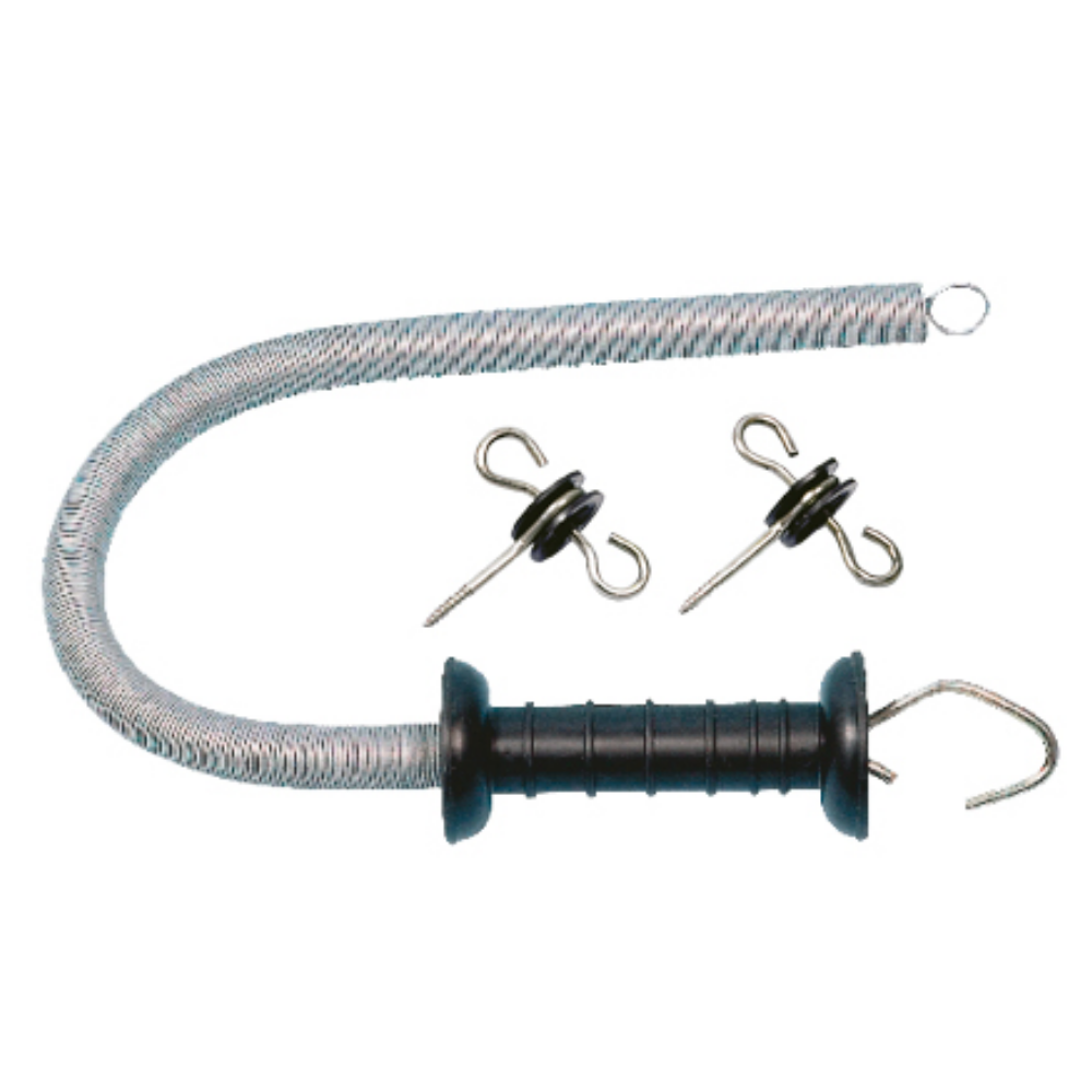 Fjädergrinden levereras som komplett kit med handtag och två grindisolatorer,
