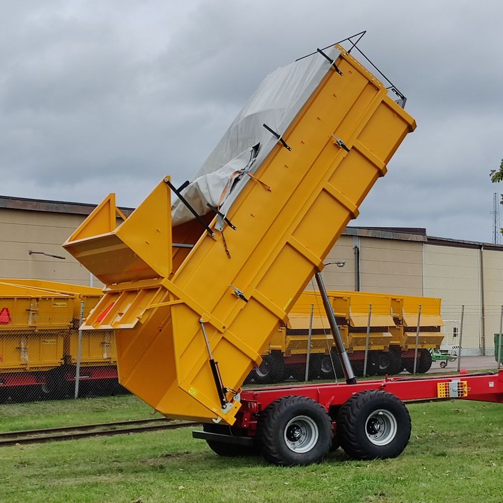 850mm förhöjningslämmar + kapell. Volymen ökar från 7,4 upp till 16,4m³. Presenningen behöver inte öppnas (som på bilden) vid tömning utan följer med luckan upp automatiskt.