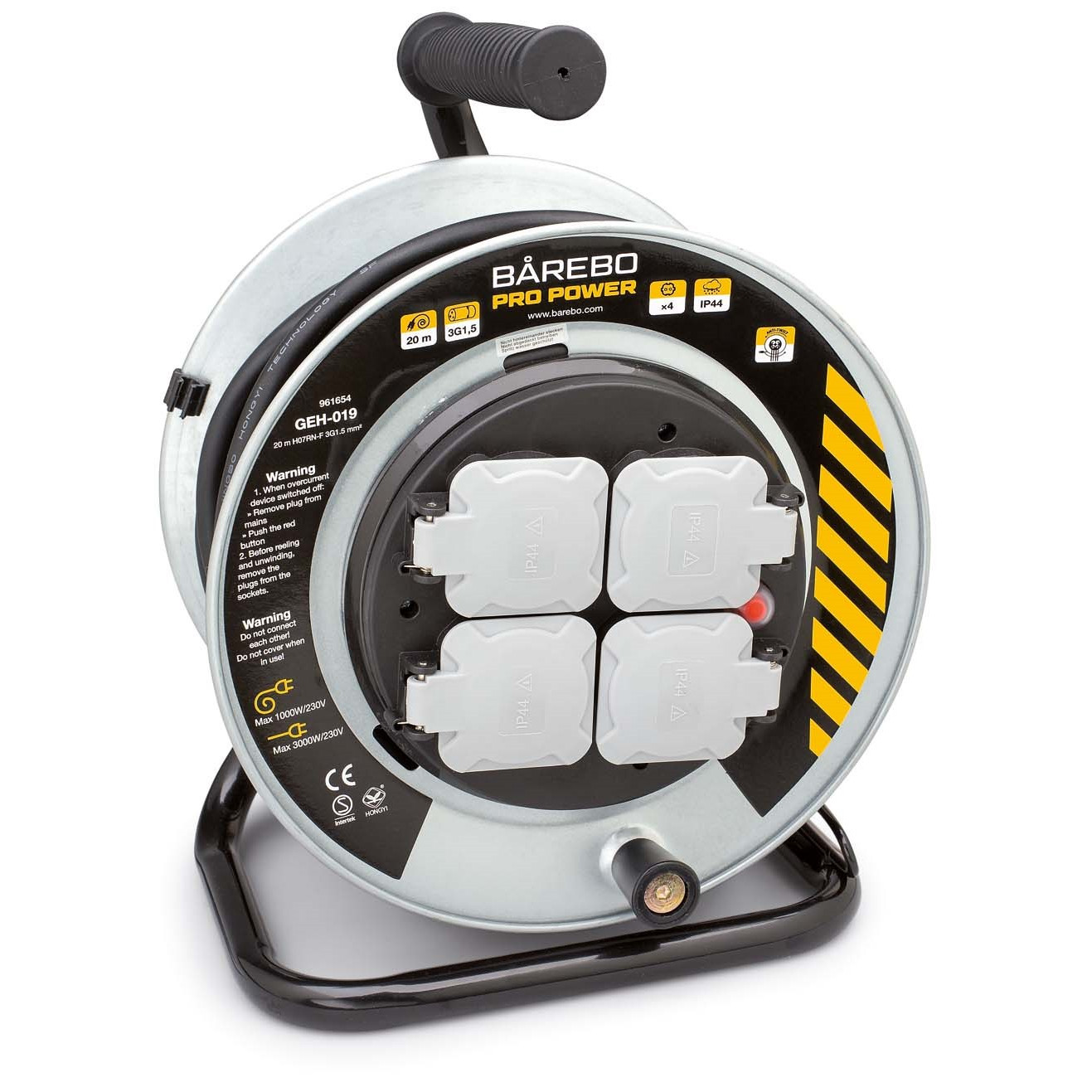 Kabelvinda med stålrörsstativ och handtag. Med extra förstärkt oljebeständig kabel av gummi, H07RN-F 3G1,5 mm². Anti-Twist funktionen innebär att navet är stillastående vid in- och utrullning av kabeln. 4 jordade uttag med lock och överbelastningsskydd. Med kabelstyrning som underlättar inrullning av kabeln. Max belastning: 3000W utrullad, 1000W ihoprullad. 230V~50Hz. Godkänd för utomhusbruk IP44.