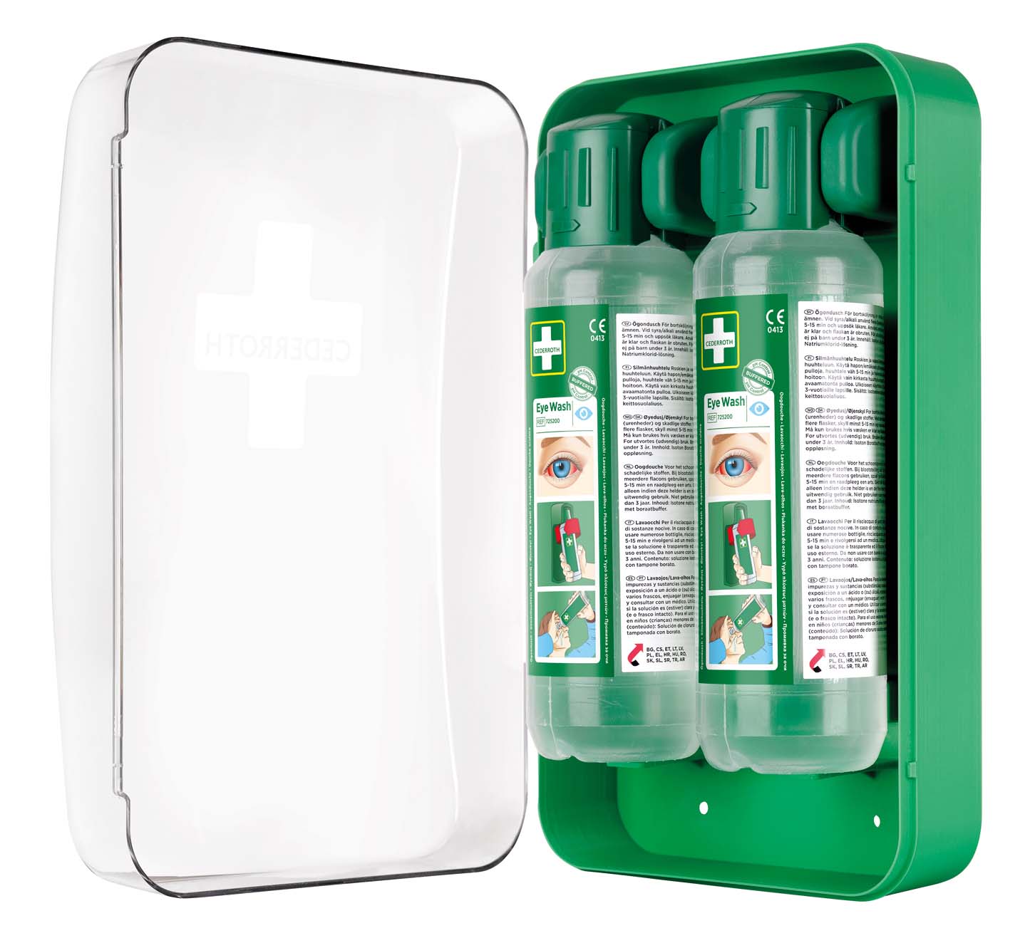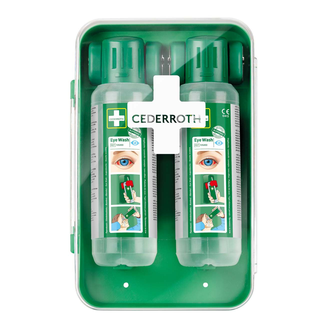 Ett kompakt ögonduschskåp som skyddar mot damm och vatten. Inkluderar 2 flaskor Cederroth ögondusch á 500 ml samt en instruktionsskylt. Lätt att få plats med även i mindre utrymmen. Transperent lucka för hög synlighet. Flaskorna öppnas automatiskt när de vrids ur hållarna och sköljning kan påbörjas omedelbart.