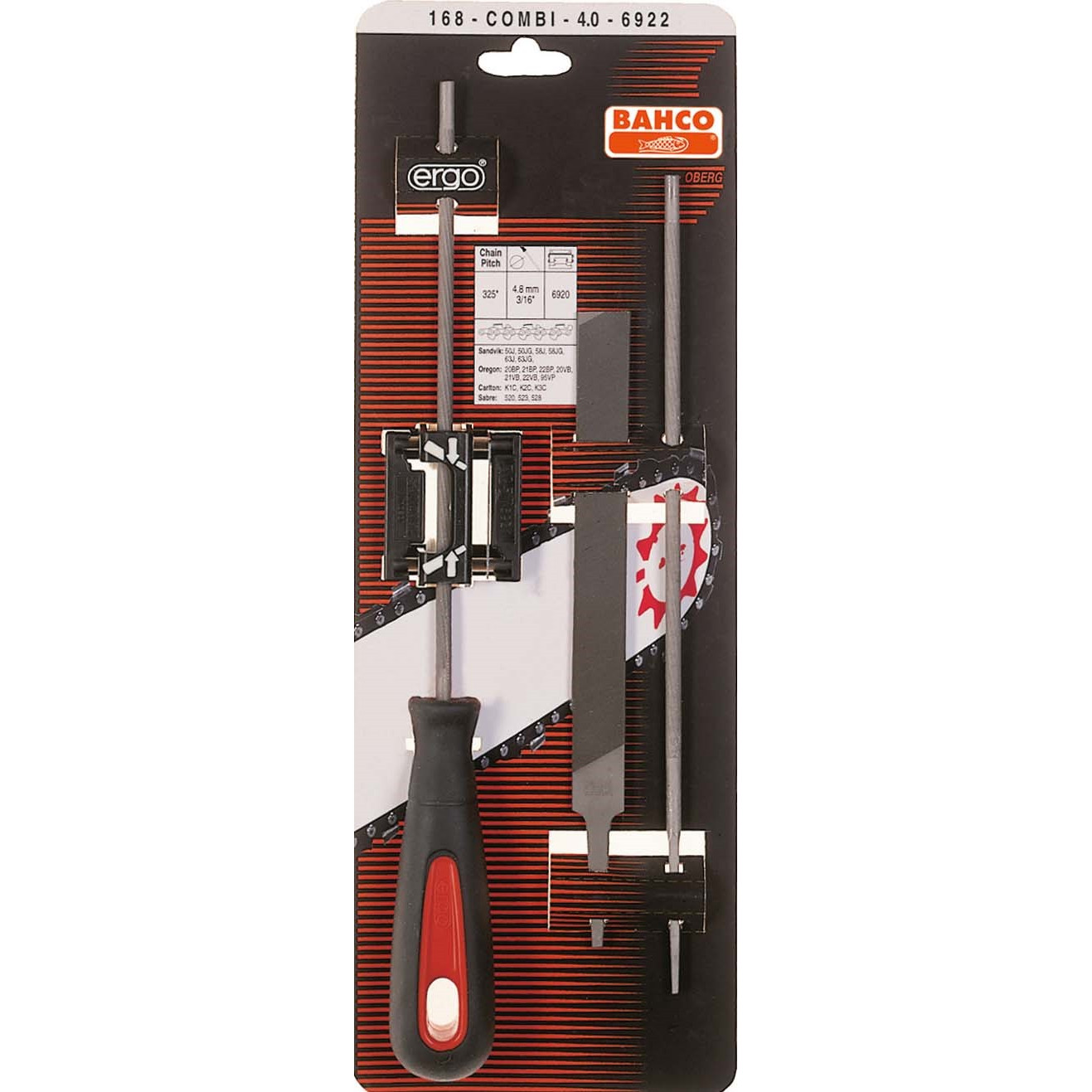 Kombinationsförpackning med två runda sågkedjefilar 168. En fil med Ergo filskaft. Förpackningen innehåller dessutom en 6″ flat sågkedjefil. En filmall är också inkluderad för att garantera bästa möjliga filningsresultat både med den runda och den flata sågkedjefilen.