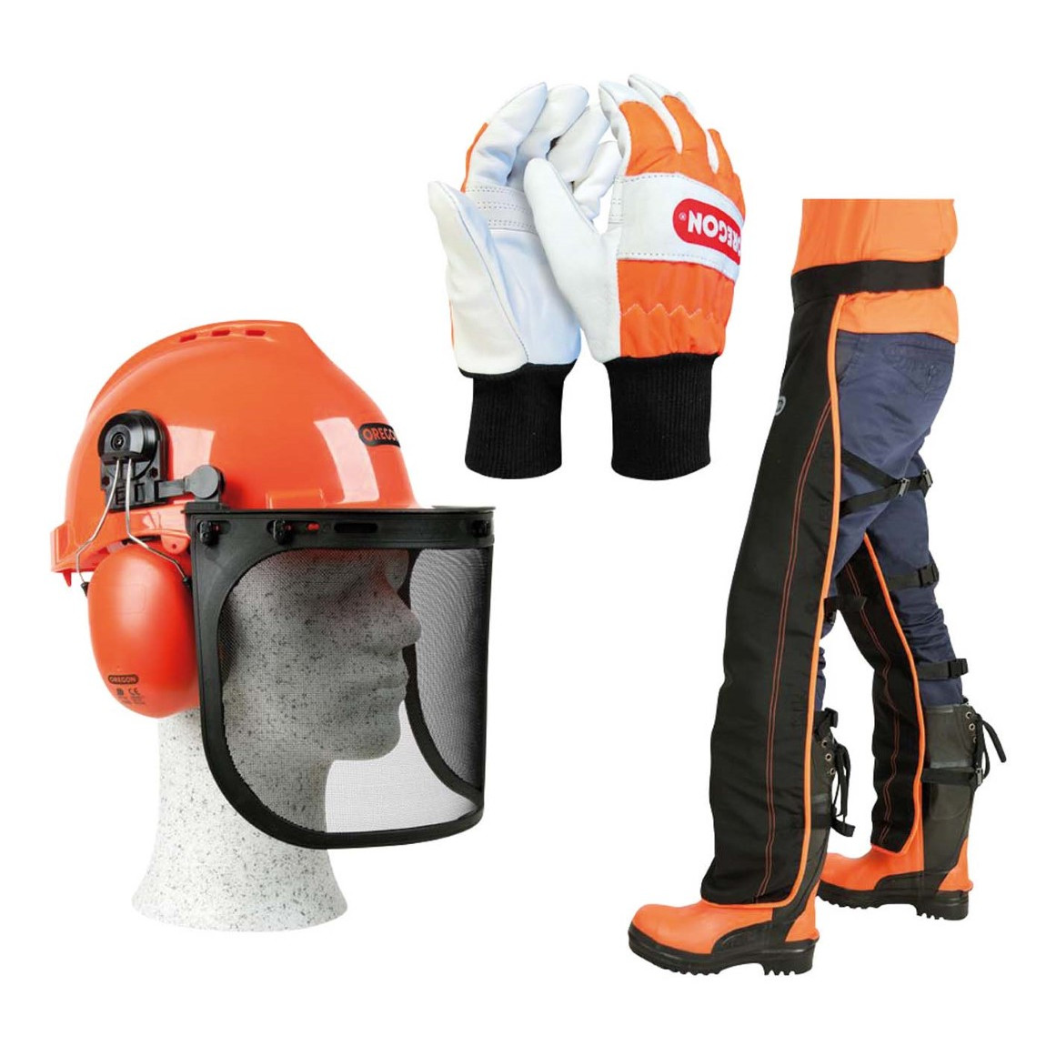 Det optimala säkerhetskittet för vedbacken. Innerhåller byxholk, handskar och hjälm med visir.